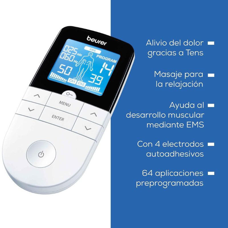 Elย Electroestimulador digital 3 en 1 de Beurer es ideal para el alivio del dolor, el fortalecimiento muscular y la relajaciรณn mediante masaje. Su tecnologรญa permite el uso individual o combinado de las funciones TENS, EMS y masaje, con una interfaz intuitiva y una pantalla LCD retroiluminada.