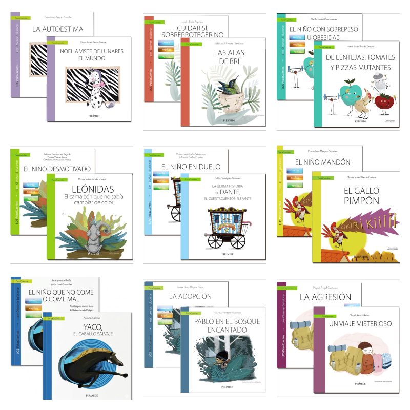 EL NIÑO QUE NO COME O COME MAL + YACO, EL CABALLO SALVAJE, LAS PESADILLAS + ALEX Y EL MONSTRUO DE LOS OJOS ROJOS, EL NIÑO EN DUELO + LA ÚLTIMA HISTORIA DE DANTE, EL CUENTACUENTOS ELEFANTE, LA TRISTEZA + EL ARCOIRIS, LA ADOPCIÓN + PABLO EN EL BOSQUE ENCANTADO, LAS RABIETAS + PLANETA RABIETA, MI MAMÁ Y MI PAPÁ SE SEPARAN + MI MUÑECA AUDELINA, LA MENTIRA + MIGUEL Y EL DRAGÓN EDELVÍN, CUIDAR SI, SOBREPROTEGER NO + LAS ALAS DE BRI, EL NIÑO CON SOBREPESO U OBESIDAD + DE LENTEJAS, TOM ATES Y PIZZAS MUTANTES, EL NIÑO MANDÓN + PIMPÓN, EL GALLO MANDÓN, MAMITIS Y PAPITIS. ¡MAMÁ, NO TE VAYAS! + LLAMADME MANUEL, POR FAVOR, EL NIÑO DESMOTIVADO + LEÓNIDAS. EL CAMALEÓN QUE NO SABÍA CAMBIAR DE COLOR, LA AGRESION + UN VIAJE MISTERIOSO, LA AUTOESTIMA + NOELIA VISTE DE LUNARES EL MUNDO, AYUDO A MI HIJO CUANDO ESTA MALITO + CLAUDIO, SILBIN Y EL JARABE, ABORDAR LA DIVERSIDAD EN FAMILIA + EL HADA NOMITSO, NIÑOS DE ALTA DEMANDA + LISA Y LA CAJA DE LOS BUENOS PROPOSITOS, EL NIÑO AL QUE LE CUESTA HACER AMIGOS + EL VIAJE EN TREN DE MATEO, LOS NIÑOS TAMBIEN SE PREOCUPAN + ROSITA Y SU LIBRETA DE LAS NORIAS, LOS CELOS + UN BEBE LLEGA A CASA, LA DESOBEDIENCIA DEL NIÑO QUE SE HACE EL "SORDO" + MANCHAS, EL PERRITO DESPISTADO
