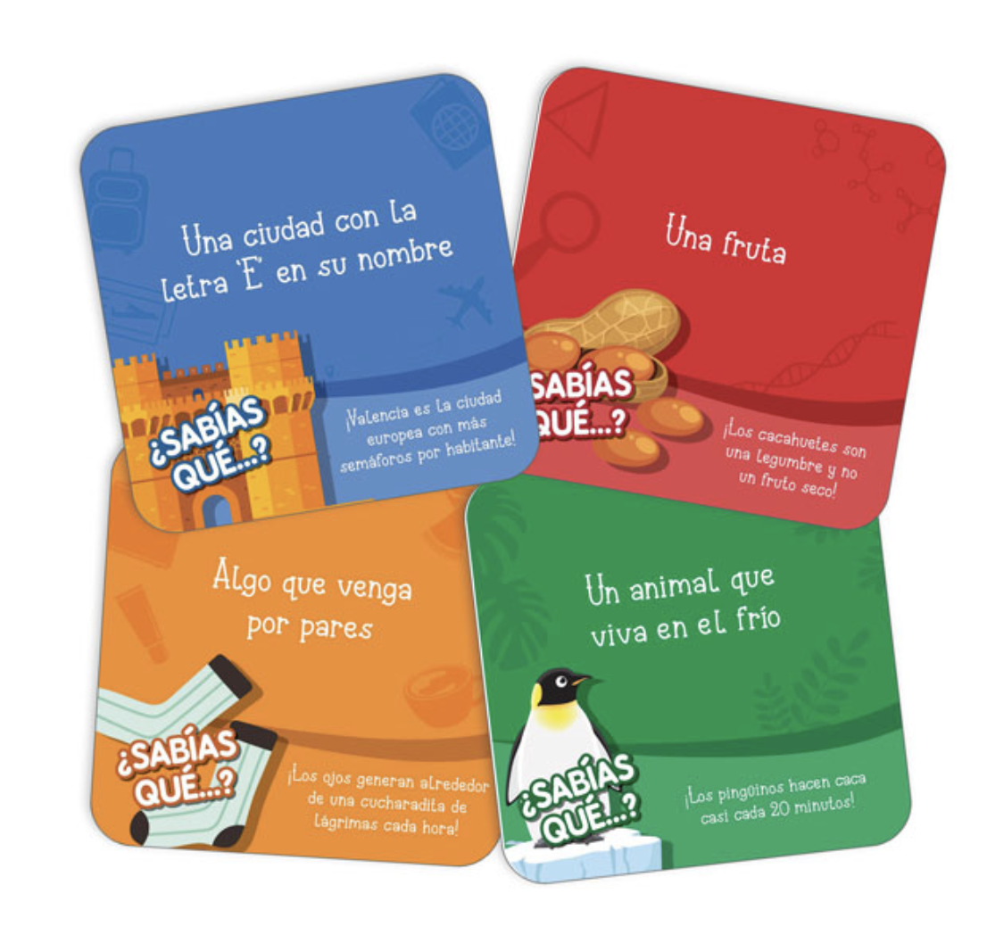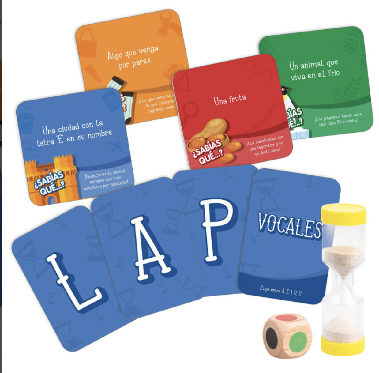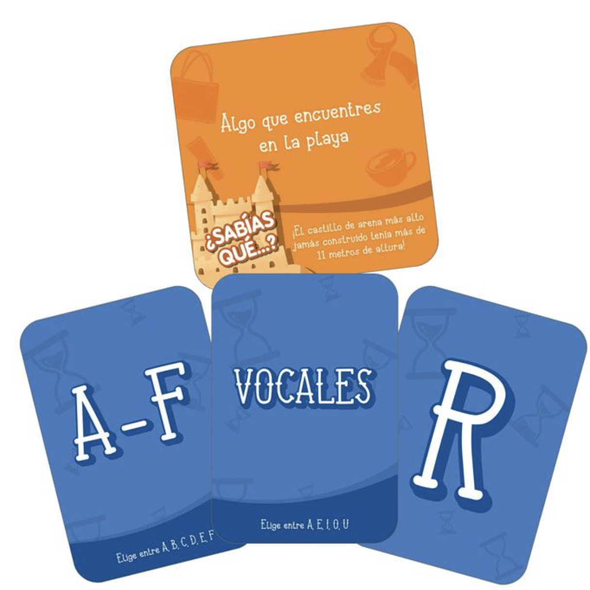 ยฟListos para la carrera? Tira el dado para elegir la carta de categorรญa y gira el reloj de arena. ยกContrarreloj! Di una respuesta para deshacerte de cartas de letra.