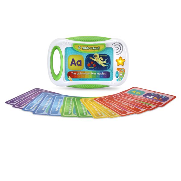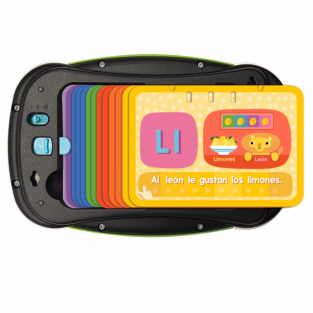 ¡DESCUBRE CÓMO LEO A TU RITMO! Lector electrónico con 14 tarjetas que muestran imágenes divertidas y frases alocadas para enseñar las letras minúsculas y mayúsculas, además de vocabulario relacionado con cada una. A la vez que pasan el dedo por cada frase, van escuchando las palabras y forman la base para un proceso de lectura con éxito.