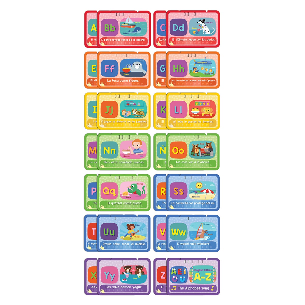 14 TARJETAS A DOBLE CARA: ¡Tú marcas la lectura! Incluye 14 tarjetas para descubrir las mayúsculas, las minúsculas y vocabulario relacionado con cada letra.