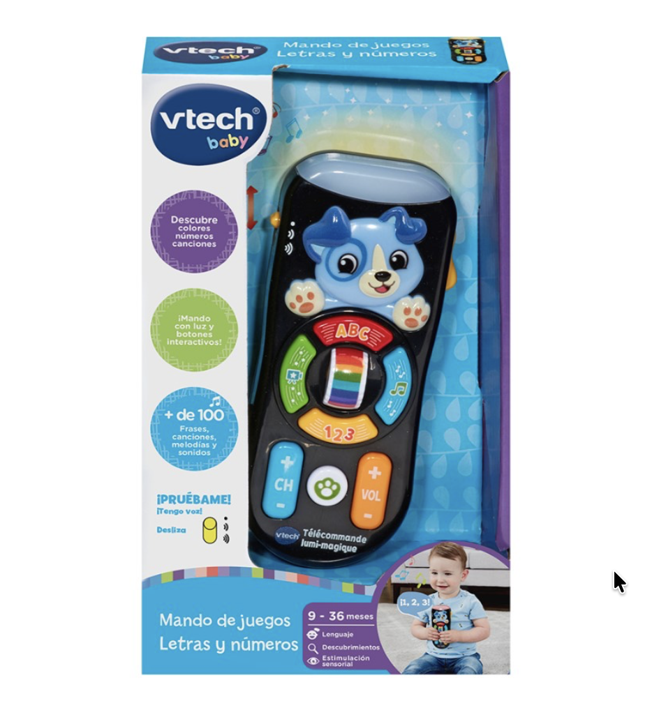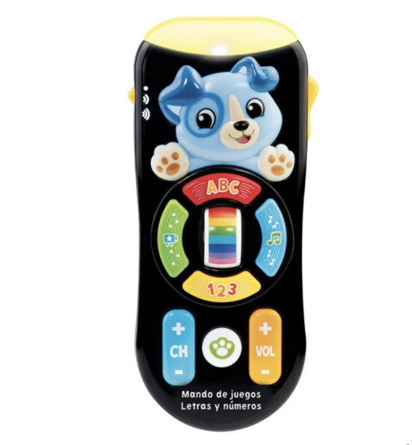 ¡Tú tienes el mando! “Mira lo que tenemos aquí!” Con el Mando de juegos los peques cambiarán de canales como los mayores. El mando a distancia se ilumina para ayudarle a descubrir colores, números, el abecedario y mucho más. Se divertirán presionando los botones para cambiar de canal o subiendo y bajando el volumen además, suena música pegadiza para bailar.