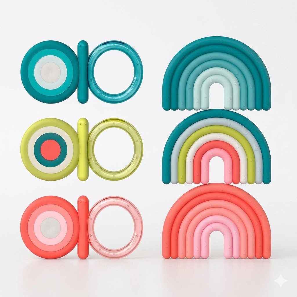 La lรญnea de mordedores estรก hecha de silicona de calidad alimentaria y estรก diseรฑada para que las manitas de los bebรฉs las agarren fรกcilmente.